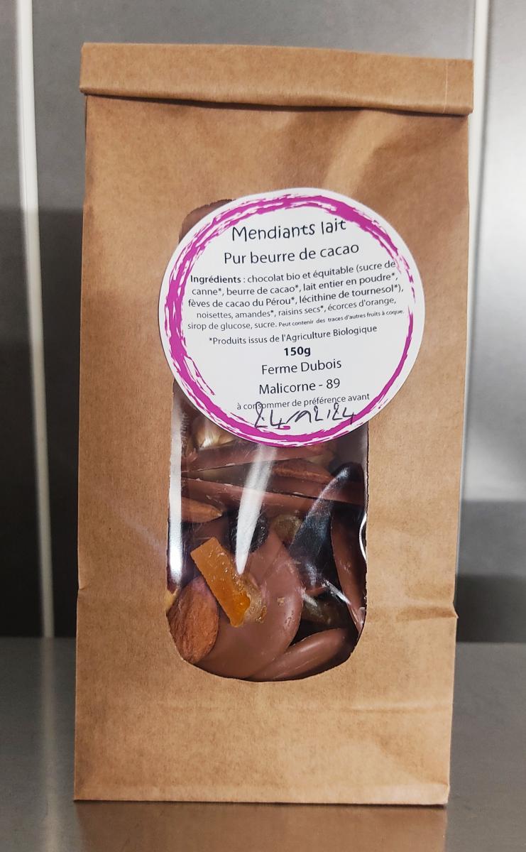 Mendiants au chocolat au lait 40% pur beurre de cacao.