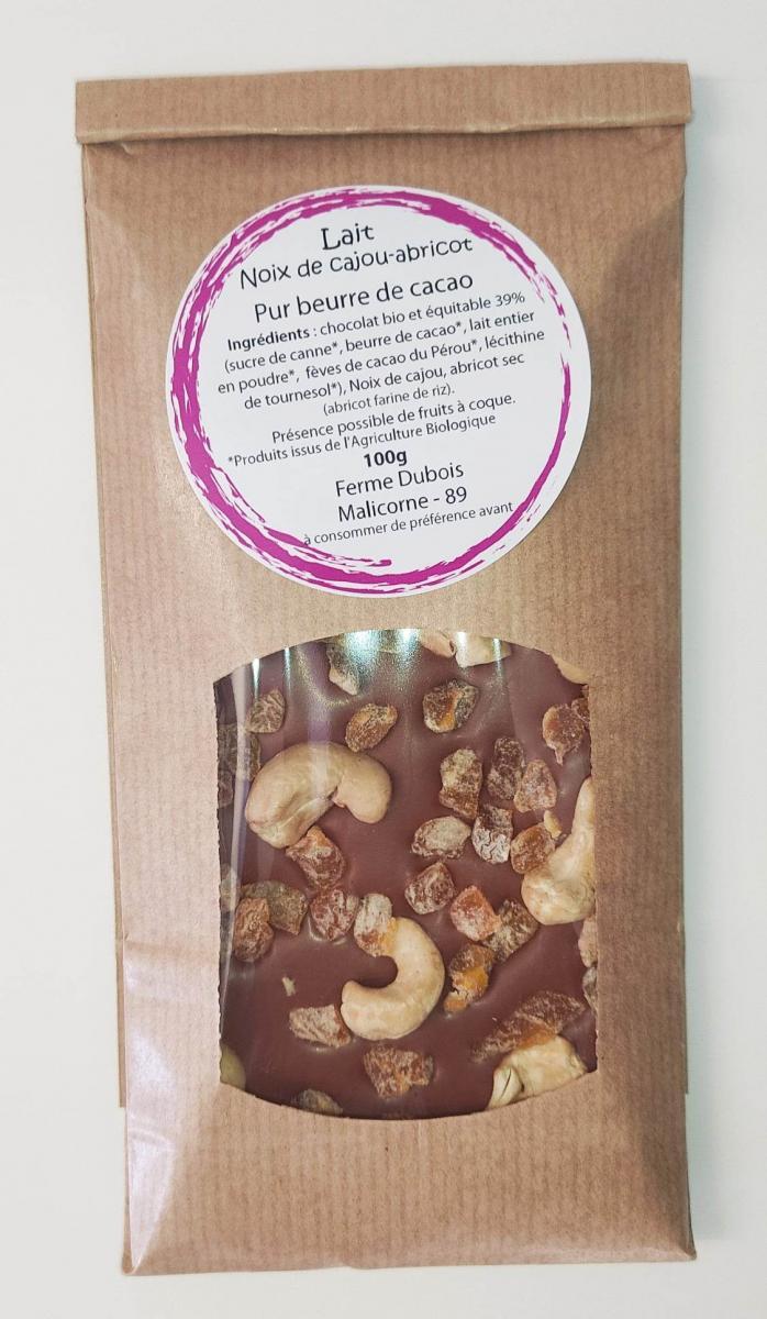 beurre de cacao, lait entier en poudre, sucre, fèves de cacao, sucre roux, extrait naturel de vanille, lécithine de tournesol, extrait de malte d'orge., noix de cajoux, abricot sec.