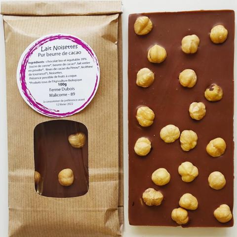 Tablette de chocolat au lait 40%.pur beurre de cacao, noisette d'Italie, raisin bio.
