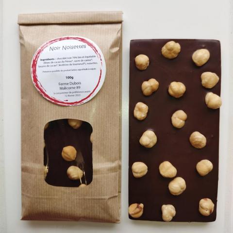 Tablette de chocolat noir 70% biologique et équitable, noisette d'Italie. pur beurre de cacao.