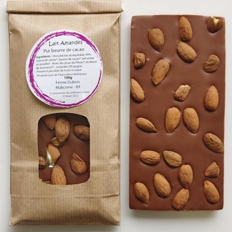 Tablette de chocolat au lait 40% amande d'Espagne. pur beurre de cacao.
