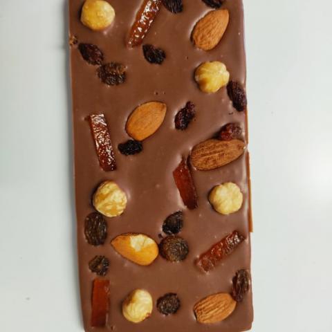 Tablette de chocolat au lait 40% fruits du mendiant. pur beurre de cacao.
